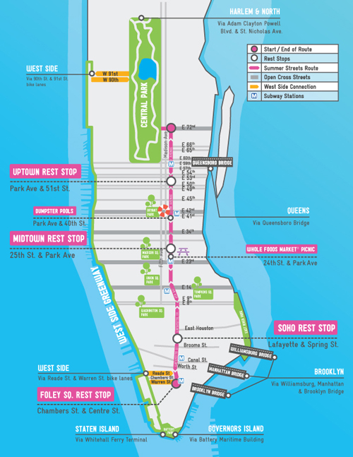 For the next three Saturdays in August, New York City will have a 6.9 mile car-free path leading from the Brooklyn Bridge in Lower Manhattan to the East 72nd Street entrance of Central Park. The street closures will occur from 7 a.m. to 1 p.m. on three consecutive Saturdays in August, the 7th, 14th and 21st. The streets to be closed are Centre Street, Lafayette Street, 4th Avenue and Park Avenue.