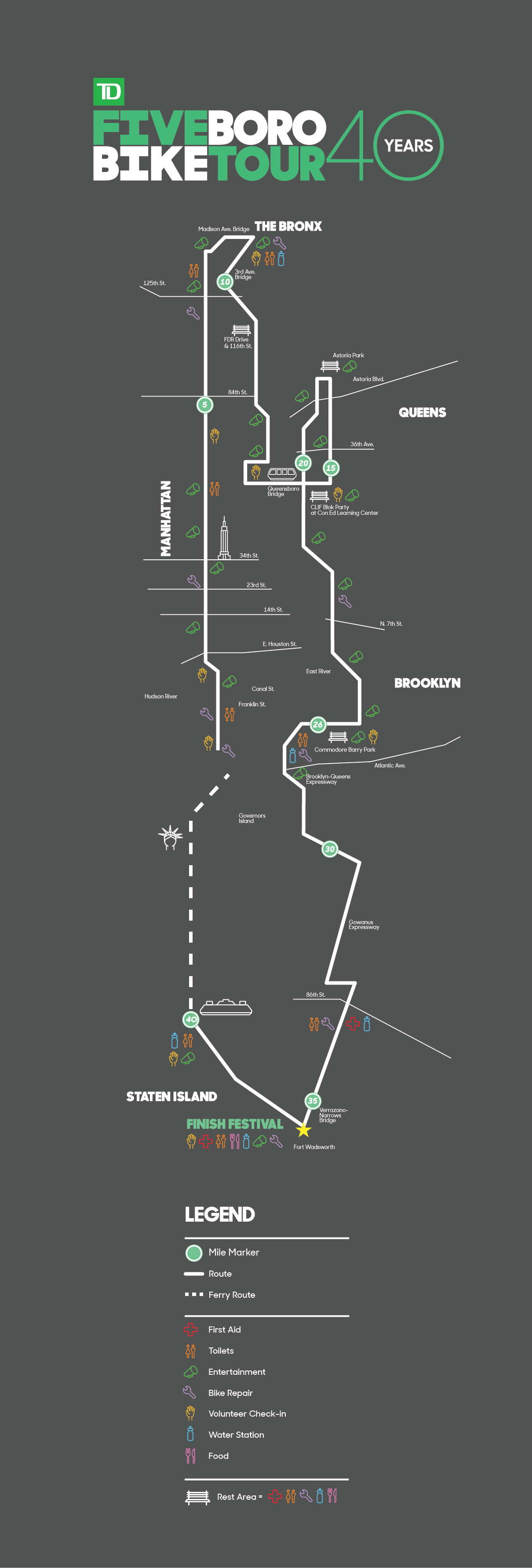 The Tour begins in Lower Manhattan in staggered start waves, which correspond to the color of your bib and bike plate (which you’ll receive when you pick up your rider packet at the Expo). In the event that members of your group are assigned to different start waves, please ride together in a later wave. Check back for more details.
